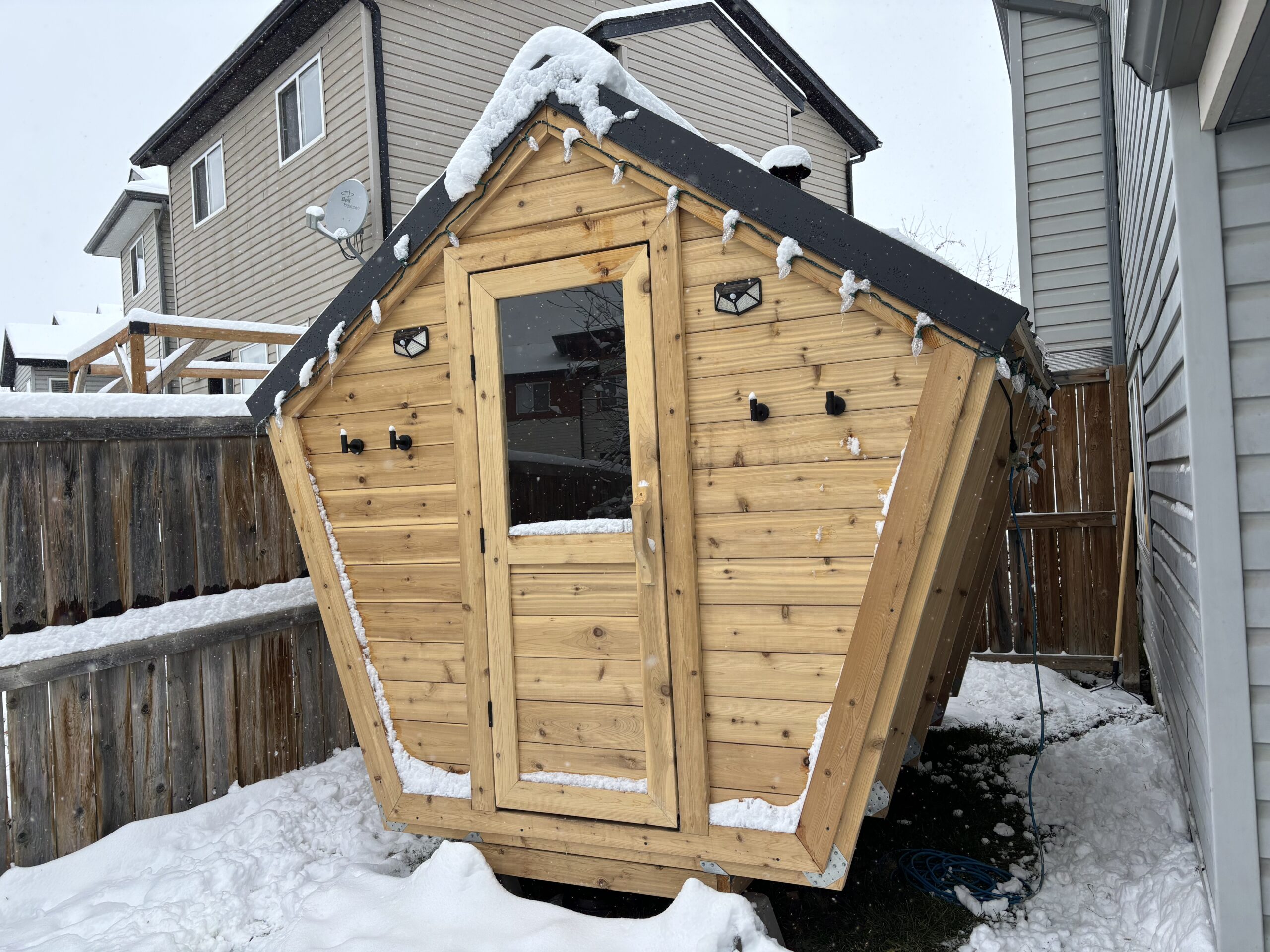 We offer on-site installation at no cost (within 100km of Calgary, Alberta). This means no cranes or unexpected damage. All of our saunas are prepared in our shop and assembled in your yard.